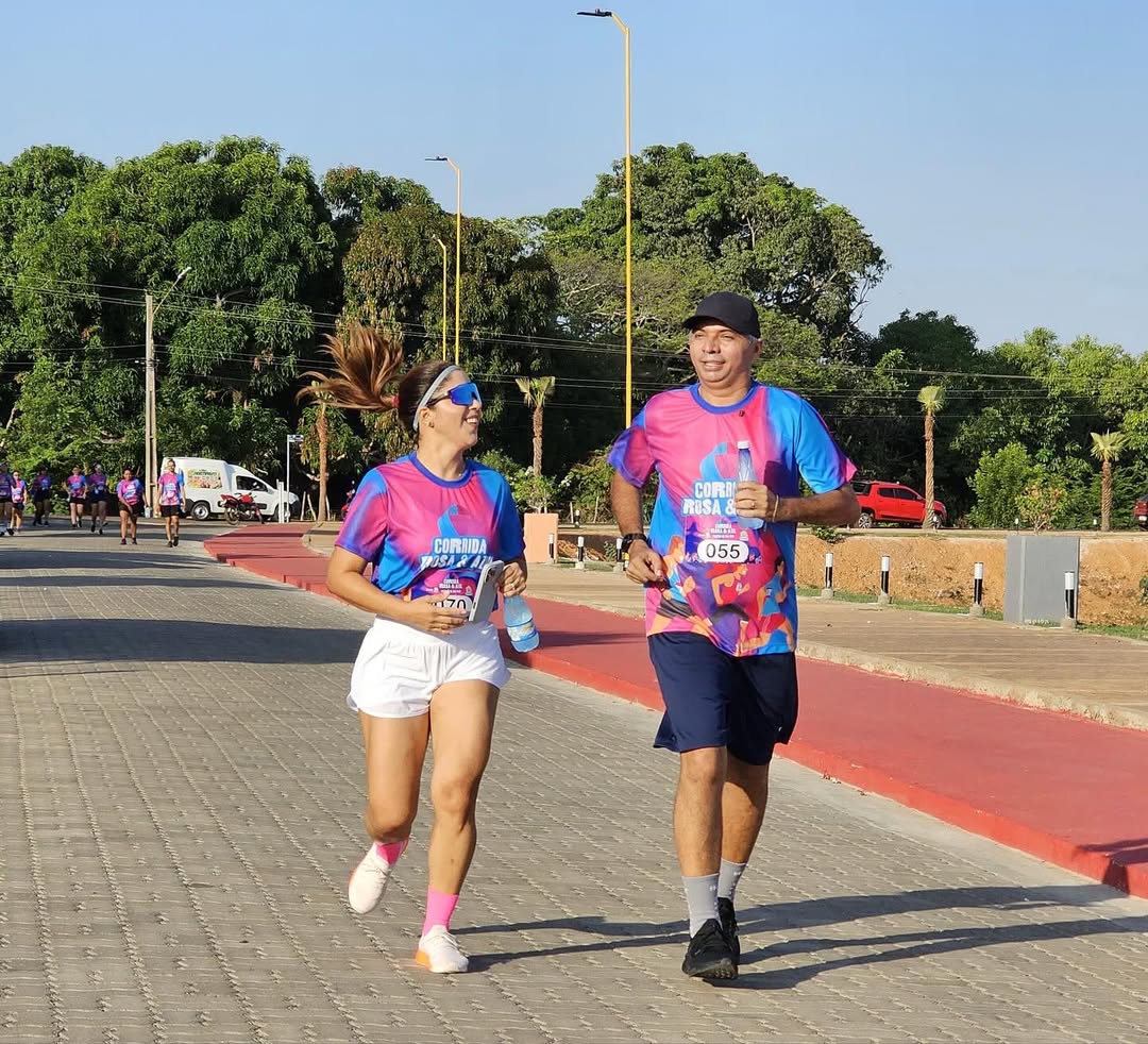 Louvável a iniciativa da Prefeitura de Nossa Senhora de Nazaré de promover a Corrida Azul e Rosa. No registro, o prefeito Zé Henrique e a primeira dama, Regiane Carla.