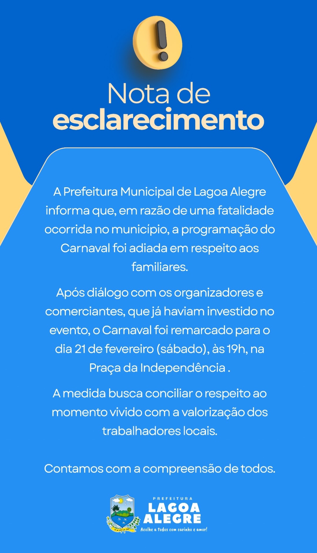 A nova data foi definida após diálogo entre a Prefeitura de Lagoa Alegre, organizadores do evento e comerciantes locais, que reforçaram a importância cultural e econômica da festa para a cidade.