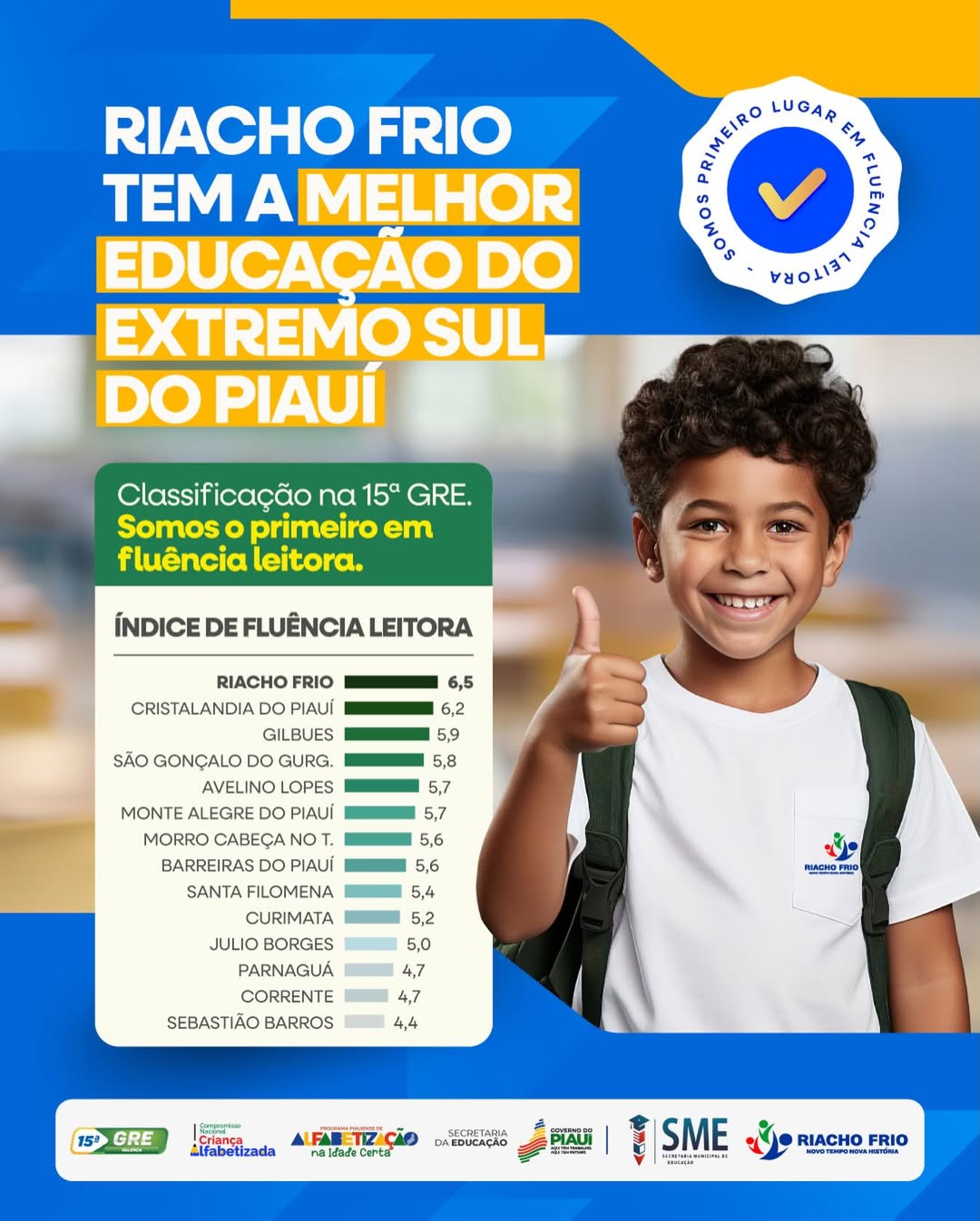 A Secretaria Municipal de Educação de Riacho Frio divulgou que o município voltou a alcançar a meta de fluência leitora entre alunos dos anos iniciais do Ensino Fundamental. Com o resultado, a rede municipal ficou em primeiro lugar no ranking da 15ª Gerência Regional de Educação (GRE), que abrange municípios do extremo sul do estado.